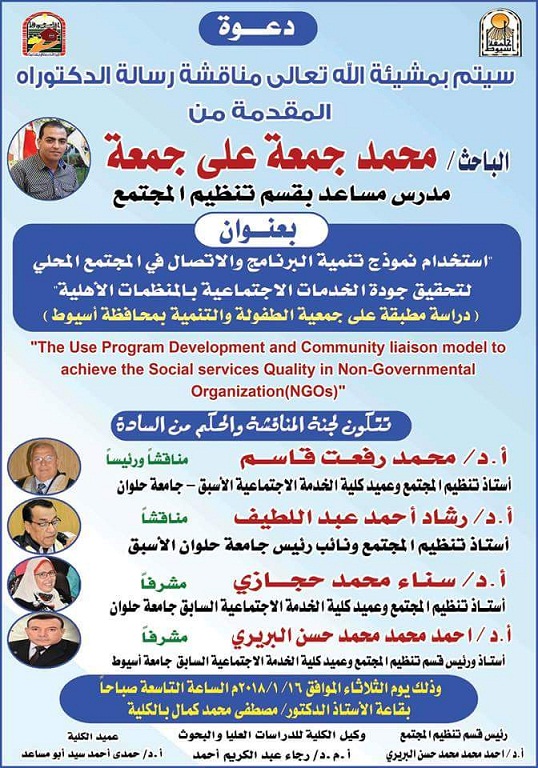 دعوة لمناقشة رسالة الدكتوراة المقدمة من الباحث/ محمد جمعة على جمعة 11 يناير 2018 دعوة لمناقشة رسالة الدكتوراة المقدمة من الباحث/ محمد جمعة على جمعة