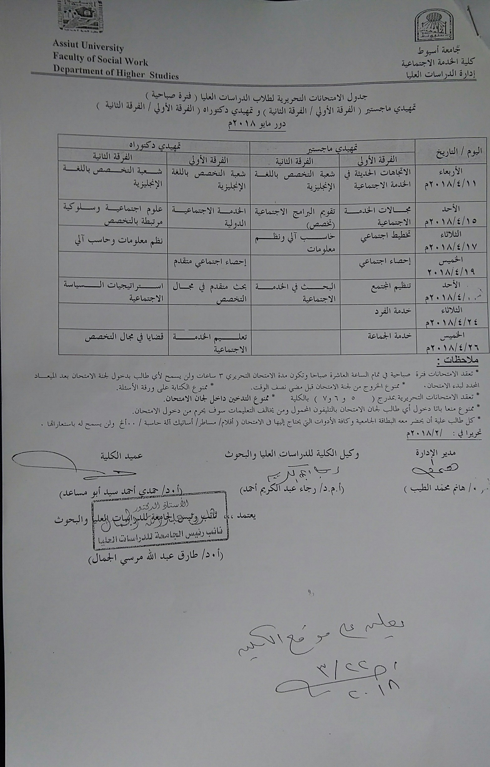 جدول الامتحانات التحريرية لطلاب الدراسات العليا (الفترة الصباحية) 22 مارس 2018 جدول الامتحانات التحريرية لطلاب الدراسات العليا (الفترة الصباحية)
