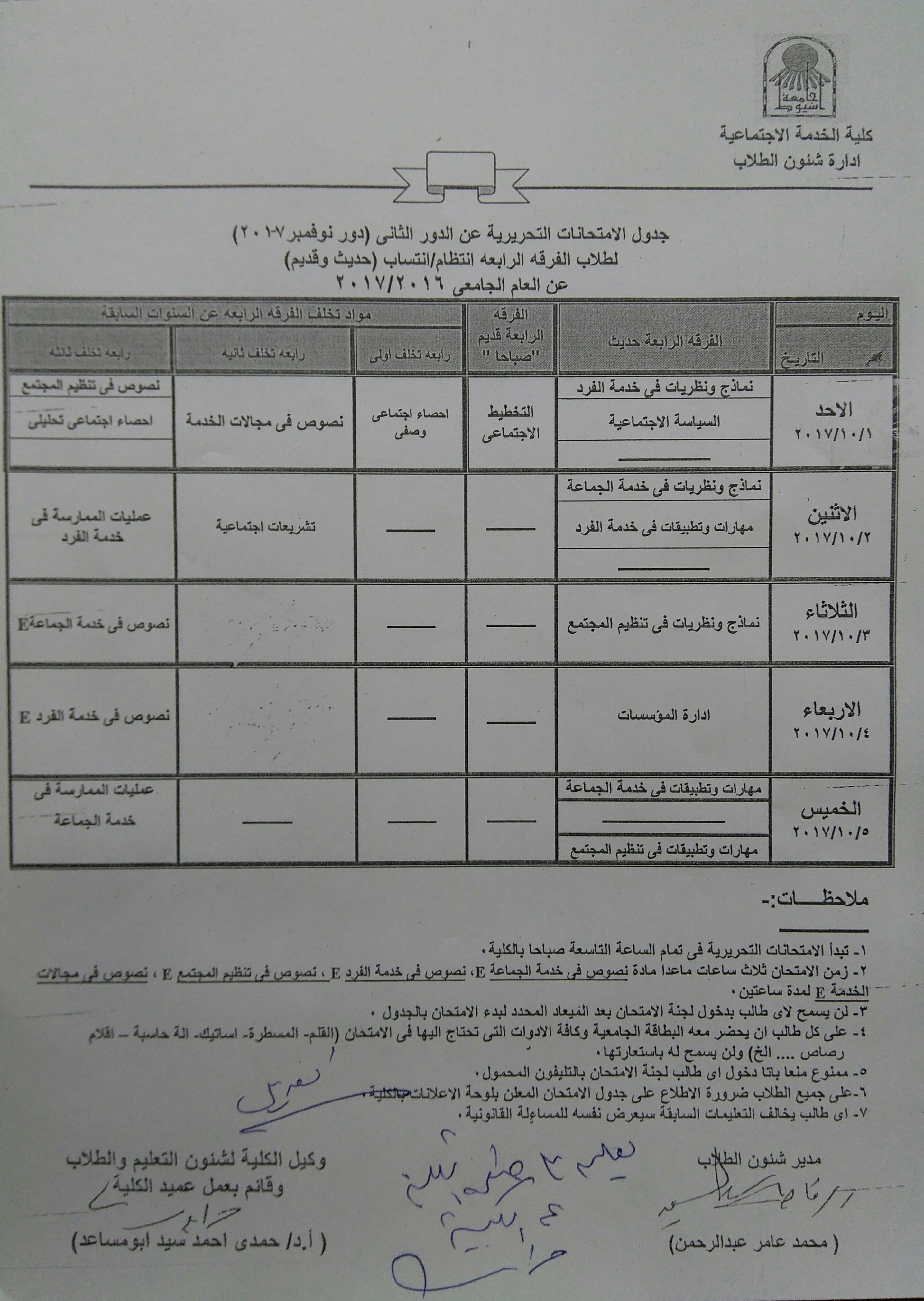 جدول الامتحانات التحريرية عن الدور الثانى لطلاب الفرقة الرابعة انتظام / انتساب دور نوفمبر ٢٠١٧م