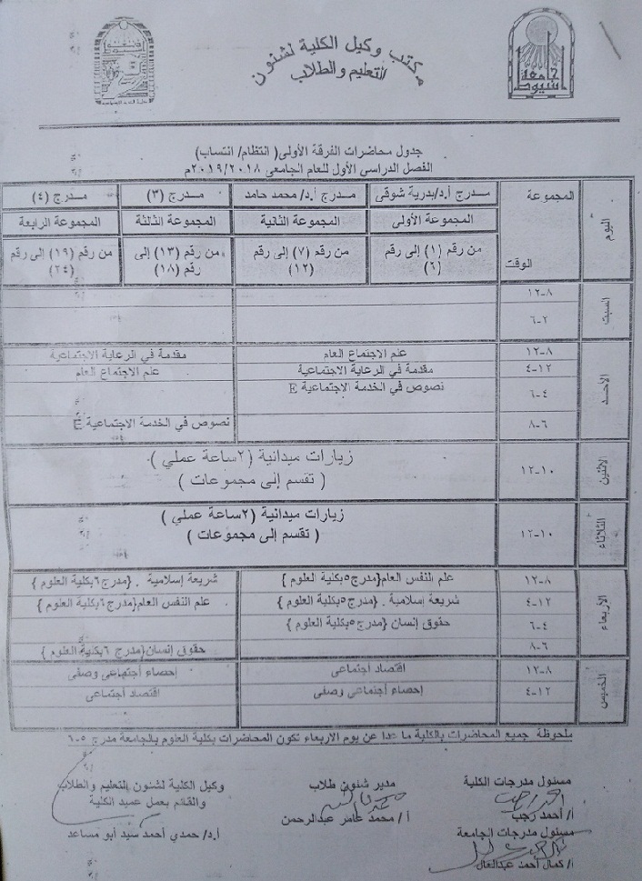 جدول محاضرات الفرقة الاولى (انتظام/انتساب) الفصل الدراسى الاول للعام الجامعى 2018/2019 23 سبتمبر 2018 جدول محاضرات الفرقة الاولى (انتظام/انتساب) الفصل الدراسى الاول للعام الجامعى 2018/2019