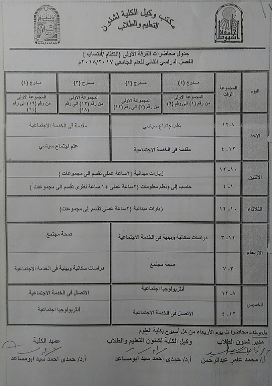 جدول محاضرات الفرقة الاولى(انتظام/انتساب) للفصل الدراسى الثانى للعام الجامعى2017/2018م 7 فبراير 2018 جدول محاضرات الفرقة الاولى(انتظام/انتساب) للفصل الدراسى الثانى للعام الجامعى2017/2018م