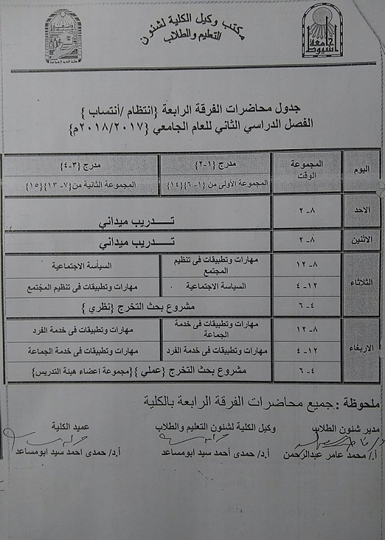 جدول محاضرات الفرقة الرابعه (انتظام/انتساب) للفصل الدراسى الثانى للعام الجامعى2017/2018م 7 فبراير 2018 جدول محاضرات الفرقة الرابعه (انتظام/انتساب) للفصل الدراسى الثانى للعام الجامعى2017/2018م