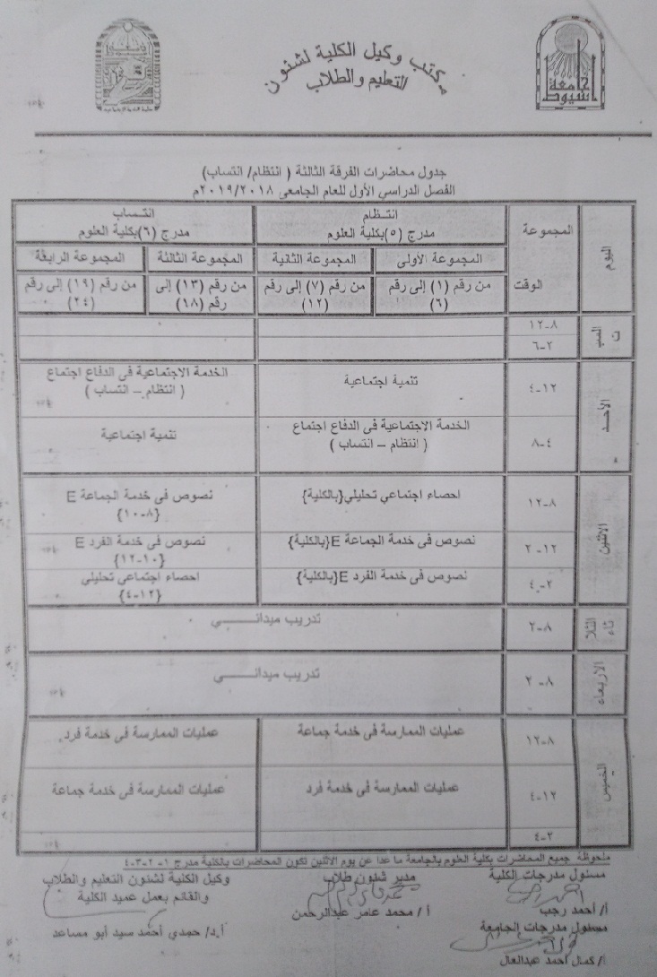جدول محاضرات الفرقة الثالثة (انتظام/انتساب) الفصل الدراسى الاول للعام الجامعى 2018/2019 23 سبتمبر 2018 جدول محاضرات الفرقة الثالثة (انتظام/انتساب) الفصل الدراسى الاول للعام الجامعى 2018/2019
