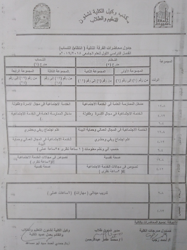 جدول محاضرات الفرقة الثانية (انتظام/انتساب) الفصل الدراسى الاول للعام الجامعى 2018/2019 23 سبتمبر 2018 جدول محاضرات الفرقة الثانية (انتظام/انتساب) الفصل الدراسى الاول للعام الجامعى 2018/2019