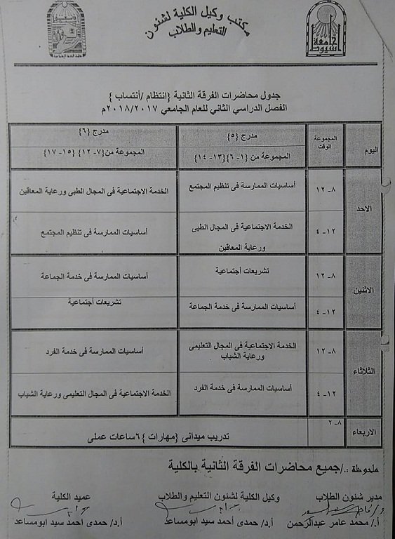 جدول محاضرات الفرقة الثانية (انتظام/انتساب) للفصل الدراسى الثانى للعام الجامعى2017/2018م 7 فبراير 2018 جدول محاضرات الفرقة الثانية (انتظام/انتساب) للفصل الدراسى الثانى للعام الجامعى2017/2018م