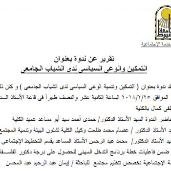 تقرير عن ندوة بعنوان التمكين والوعى السياسى لدى الشباب الجامعى