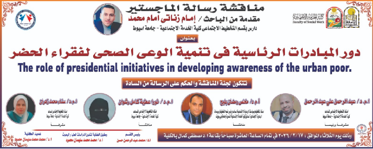 في إطار حرص كلية الخدمة الاجتماعية – جامعة أسيوط على دعم البحث العلمي وتشجيع الدراسات الجادة التي تسهم في خدمة المجتمع وتنميته، يُسعد الكلية أن تعلن عن مناقشة رسالة الماجستير المقدمة من الباحث: