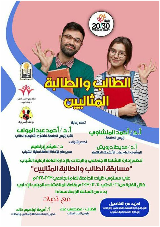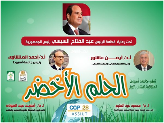 تطلق جامعة أسيوط، تحت رعاية الدكتور أحمد المنشاوي رئيس جامعة أسيوط، مؤتمر الحلم الأخضر الطلابي الأول لجامعات محافظة أسيوط، تحت عنوان: (التنمية المستدامة البيئية، والمجتمعية: المشكلات – الحلول)، والمقرر انعقاده نهاية الشهر الجاري، وذلك ضمن فعاليات المنتدى البيئي الثاني لجامعة أسيوط "Cop28-Assiut".