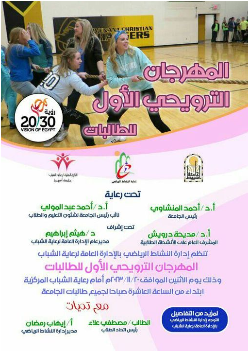 دعوة لمشاركة جميع طالبات الجامعة فقط في المهرجان الترويحي الأول لالعاب التلي ماتش (لعبة الدارتس - صيادة الاطواق- تصويب بالقدم علي مرمي كرة القدم - وثب بالحبل - تصويب باليد علي مرمي كرة اليد -الحجل باليد والقدم - جمع كرات تنس الطاولة في الصندوق )