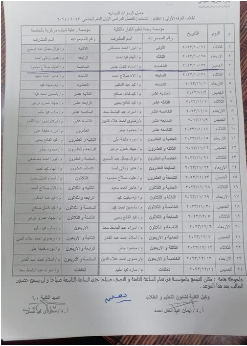 بيان بأسماء وأماكن التدريب الميداني للفرقة الرابعة للعام الجامعي ٢٠٢٣ / ٢٠٢٤م