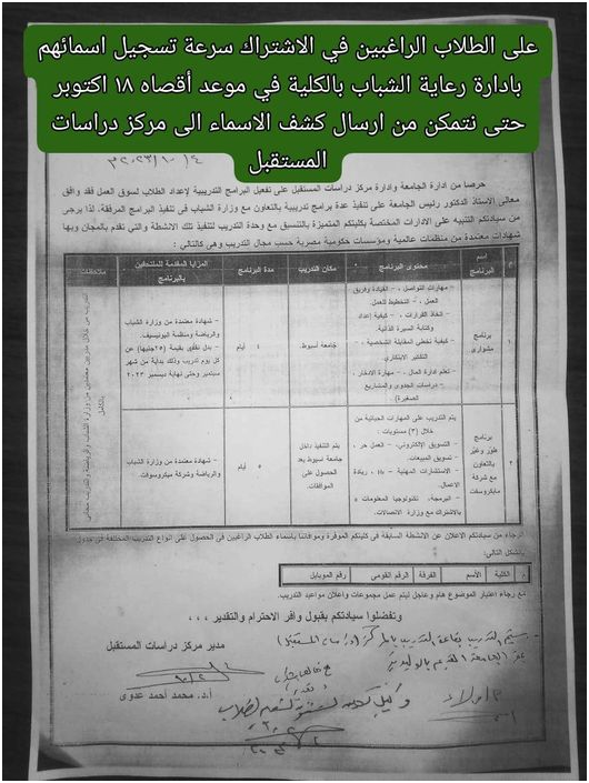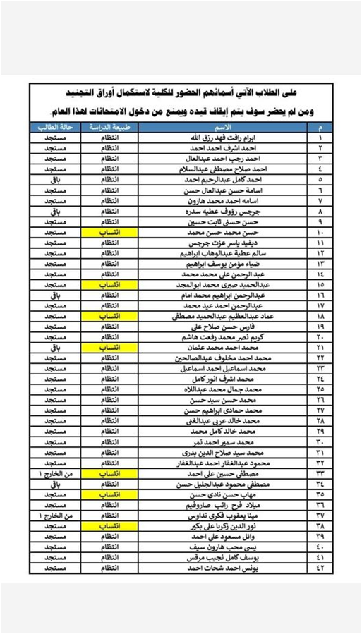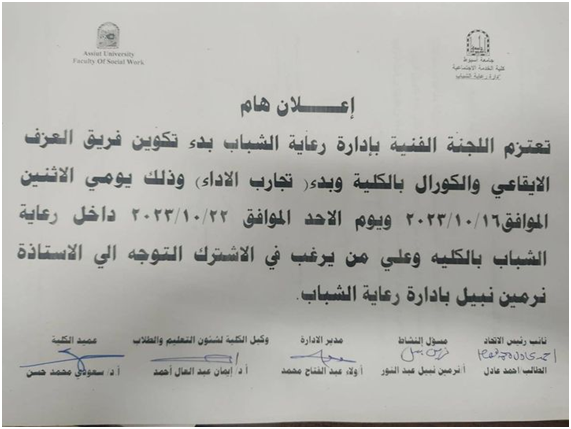 13- يتم احضار جميع الأوراق المطلوبة والمستندات في موعد أقصاه يوم الثلاثاء القادم 17/10/2023 للمراجعه بمكتب إدارة رعايه الشباب بالكلية