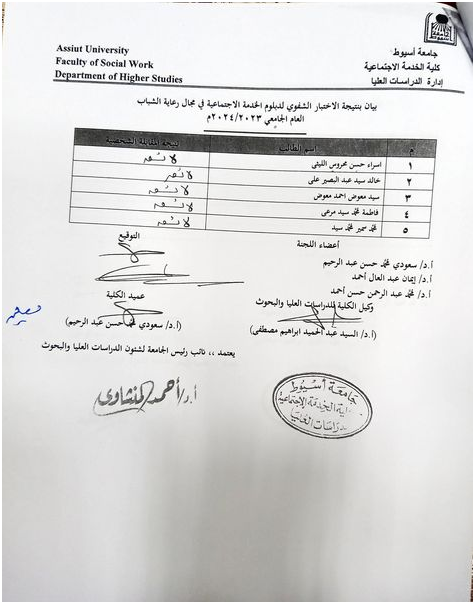 **وفي حالة عدم مراجعة الطالب للمستندات من قبل إدارة رعاية الشباب بالكلية فالطالب مسئول عن عدم قبول الأوراق من مكتب المساعدات الاجتماعية