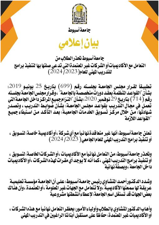 على جميع المراحل لطلاب جامعة أسيوط .. سيتم عقد دورة التربية العسكرية رقم (19) فى المدة من 29 / 9 / 2023 إلى 12 / 10 / 2023، وعلى جميع الطلاب سرعة التقدم والتسجيل يدويا؛ عن طريق إدارة التربية العسكرية بالجامعة، وذلك إعتبارا من يوم 19 / 9، وعلى الطلاب المتقدمين للتسجيل استلام كارت التسجيل، والتعليمات الخاصة بالدورة؛ فور التسجيل بإدارة التربية العسكرية.