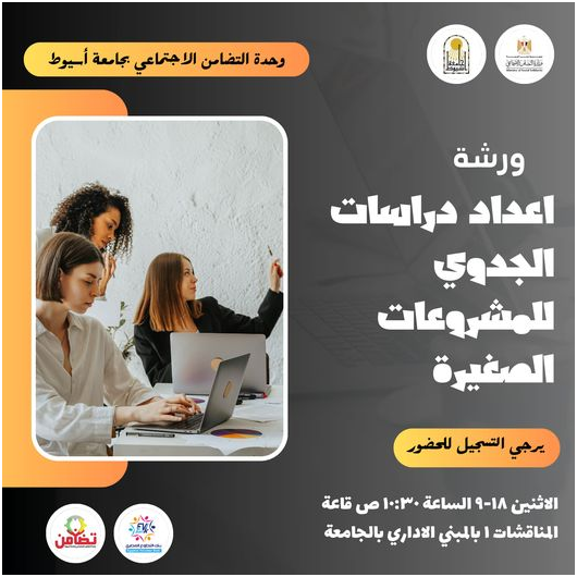 تعلن وحدة التضامن الإجتماعى بالجامعة وبالتعاون مع بنك التطوع المصري EVBank عن اقامة ورشة بعنوان "اعداد دراسات الجدوي للمشروعات الصغيرة" وذلك يوم الاثنين الموافق ١٨/ ٩/ ٢٠٢٣ الساعة العاشرة والنصف صباحا بقاعة المناقشات ١ بالمبني الاداري بالجامعة.