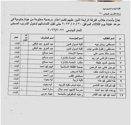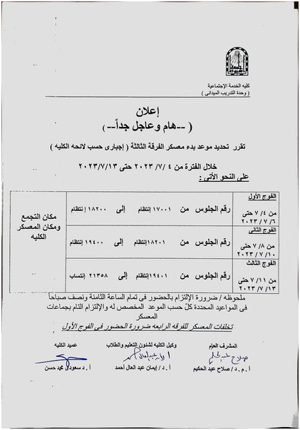 بيان جماعات المعسكر موزعة بأرقام الجلوس برجاء الإلتزام بالموعد والمكان المحدد لكل مجموعة