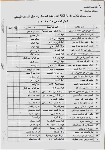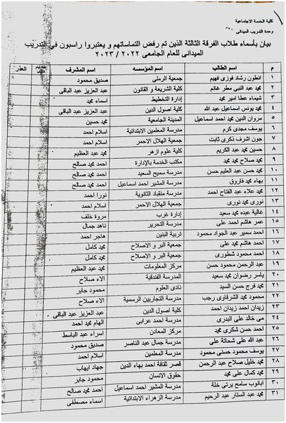 تابع بيان بأسماء طلاب الفرقة الثالثة الذين تم رفض التماساتهم ويعتبروا راسبون فى التدريب الميدانى للعام الجامعى 2022/2023 Read more about تابع بيان بأسماء طلاب الفرقة الثالثة الذين تم رفض التماساتهم ويعتبروا راسبون فى التدريب الميدانى للعام الجامعى 2022/2023 1 يونيو 2023