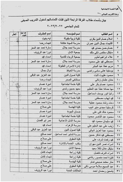 تابع بيان باسماء طلاب الفرقة الرابعة الذين قبلت التماساتهم لدخول التدريب الصيفى للعام الجامعى 2022/2023 Read more about تابع بيان باسماء طلاب الفرقة الرابعة الذين قبلت التماساتهم لدخول التدريب الصيفى للعام الجامعى 2022/2023 30 مايو 2023