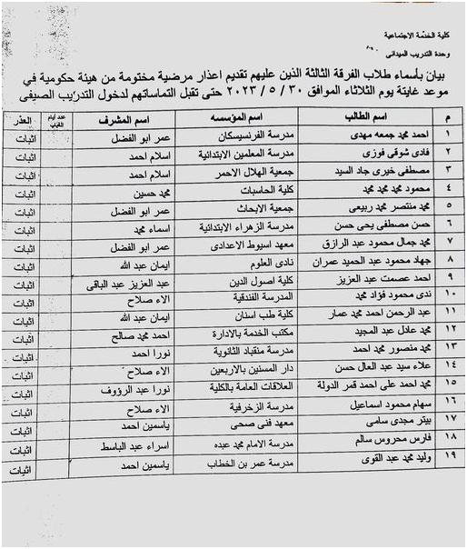 بيان باسماء طلاب الفرقة الثالثة الذين تم رفض التماساتهم ويعتبروا راسبون فى التدريب الميدانى للعام الجامعى 2022/2023 Read more about بيان باسماء طلاب الفرقة الثالثة الذين تم رفض التماساتهم ويعتبروا راسبون فى التدريب الميدانى للعام الجامعى 2022/2023 1 يونيو 2023