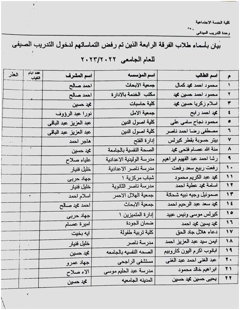 بيان بأسماء طلاب الفرقة الرابعة الذين تم رفض التماساتهم لدخول التدريب الصيفى للعام الجامعى 2022/2023 Read more about بيان بأسماء طلاب الفرقة الرابعة الذين تم رفض التماساتهم لدخول التدريب الصيفى للعام الجامعى 2022/2023 1 يونيو 2023