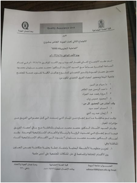 وأثنى الدكتور أحمد عبد المولى على إدارة كلية الخدمة الاجتماعية، وكافة القائمين عليها؛ لتميزهم على المستوى الأكاديمي، وكذلك لمشاركتهم في الكثير من الأنشطة الطلابية، موجهاً خالص التهنئة للدكتورة مديحة درويش؛ لتكليفها الإشراف علي الأنشطة الطلابية، متمنياً لأبناء الجامعة تحقيق المزيد من الإنجازات في مختلف المسابقات والفعاليات التي يتم تنظيمها داخل الجامعة وخارجها .