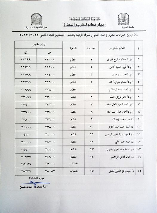 قام السيد الأستاذ الدكتور سعودى محمد حسن عميد كلية الخدمة الاجتماعية