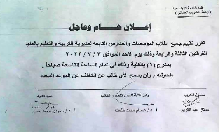 سوف يتم عقد اجتماع لجنة المكتبات يوم الخميس الموافق 7/7/2022 وذلك فى تمام الساعة الحادية عشر صباحا بمكتب السيد الاستاذ الدكتور/ وكيل الكلية لشئون الدراسات العليا والبحوث
