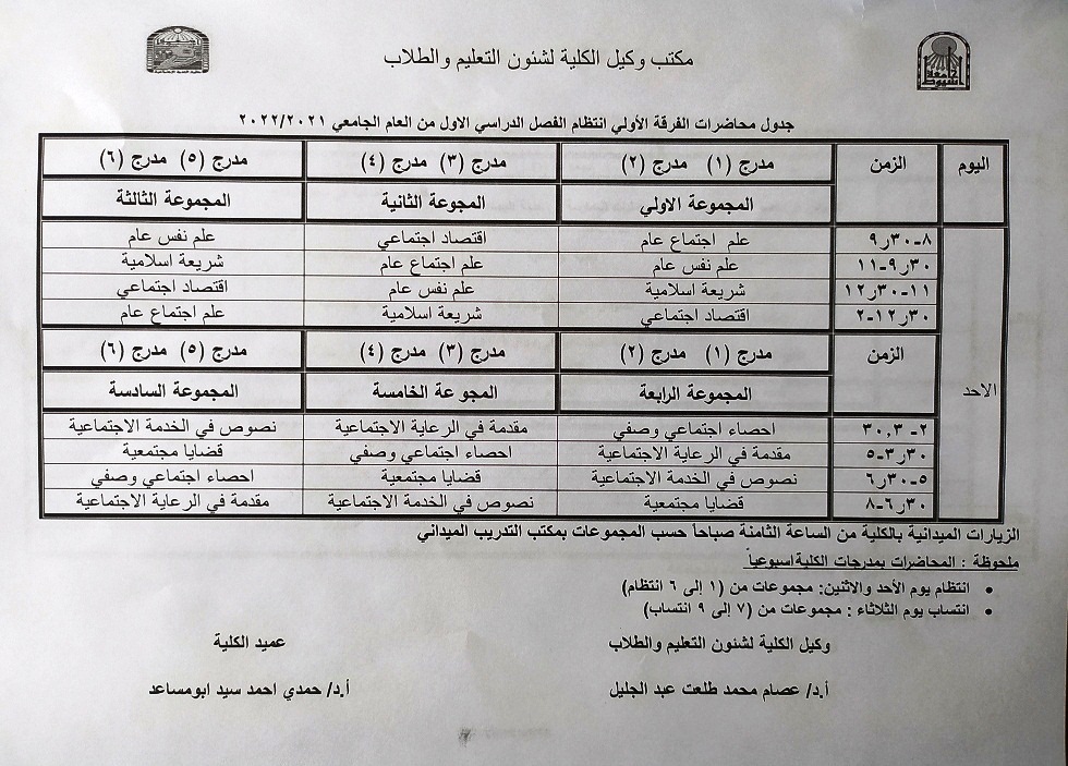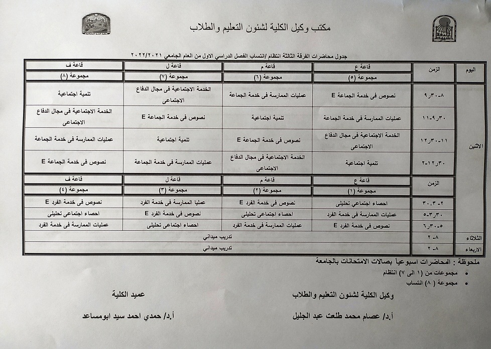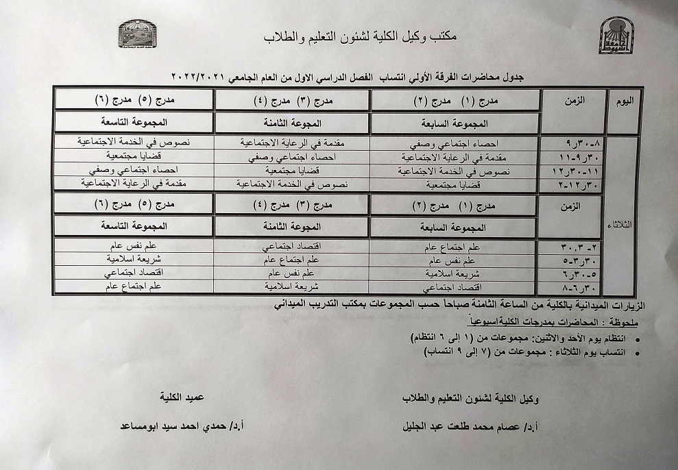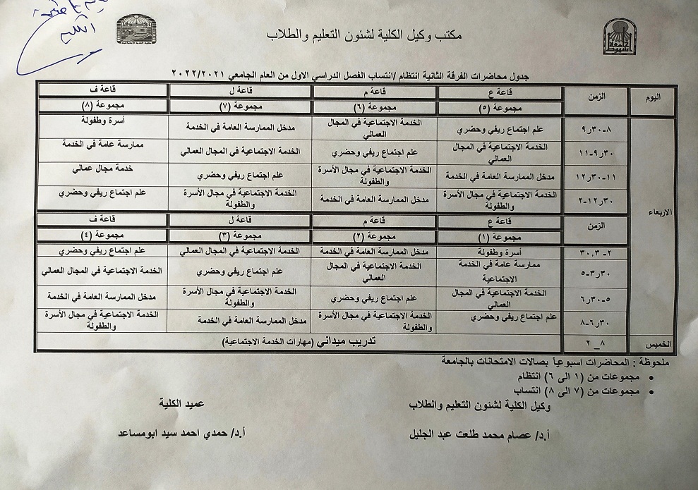 جدول محاضرات الفرقة الثانية انتظام/ انتساب الفصل الدراسى الأول من العام الجامعى 2022/2021