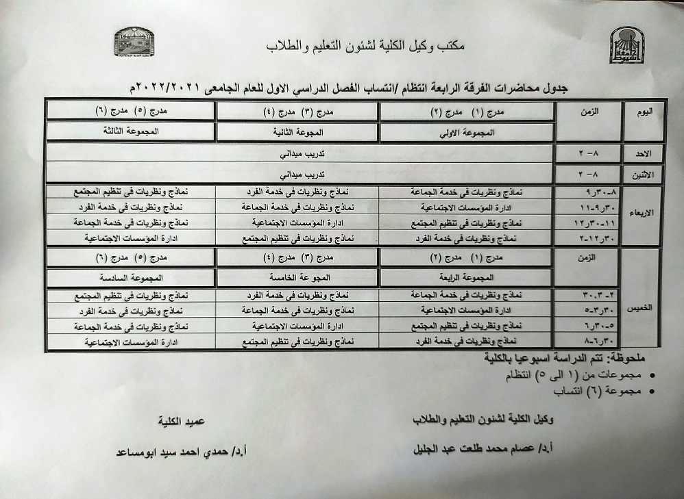 جدول محاضرات الفرقة الرابعة انتظام/ انتساب الفصل الدراسى الأول من العام الجامعى 2022/2021