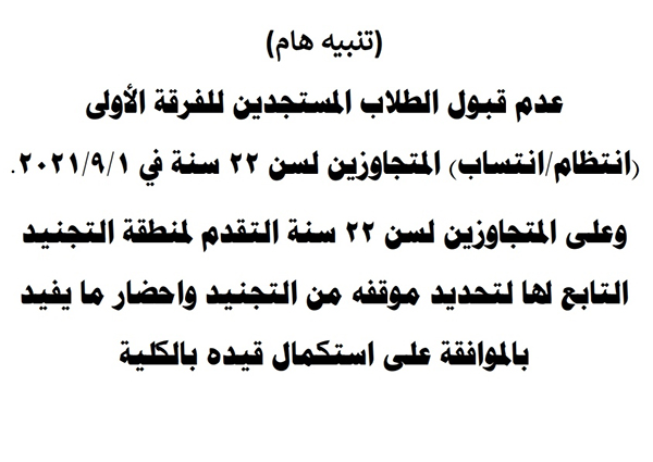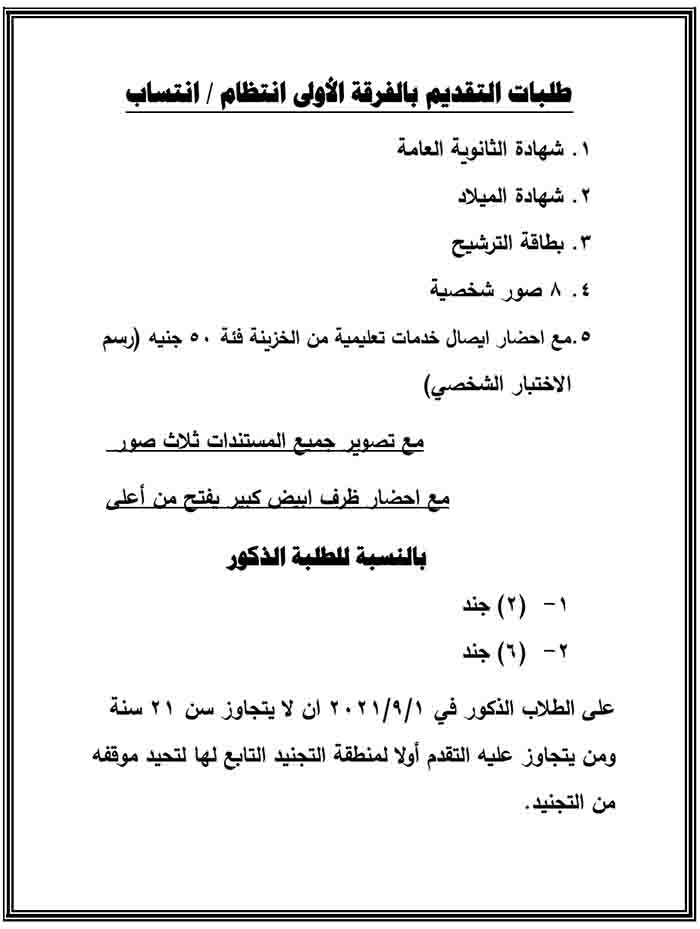 طلبات التقديم بالفرقة الأولى (انتظام/انتساب) Read more about طلبات التقديم بالفرقة الأولى (انتظام/انتساب) طلبات التقديم بالفرقة الأولى (انتظام/انتساب) 12 سبتمبر 2021