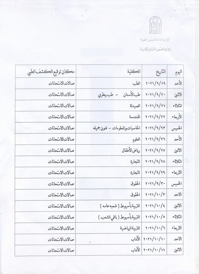 مواعيد الكشف الطبى للطلاب الجدد المرشحين للقبول بكليات الجامعه للعام الدراسى ٢٠٢١/٢٠٢٢م Read more about مواعيد الكشف الطبى للطلاب الجدد المرشحين للقبول بكليات الجامعه للعام الدراسى ٢٠٢١/٢٠٢٢م مواعيد الكشف الطبى للطلاب الجدد المرشحين للقبول بكليات الجامعه للعام الدراسى ٢٠٢١/٢٠٢٢م 15 سبتمبر 2021
