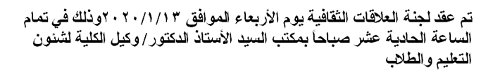اجتماع لجنة العلاقات الثقافية Read more about اجتماع لجنة العلاقات الثقافية اجتماع لجنة العلاقات الثقافية تصنيف الخبر Alumni 4 يناير 2021