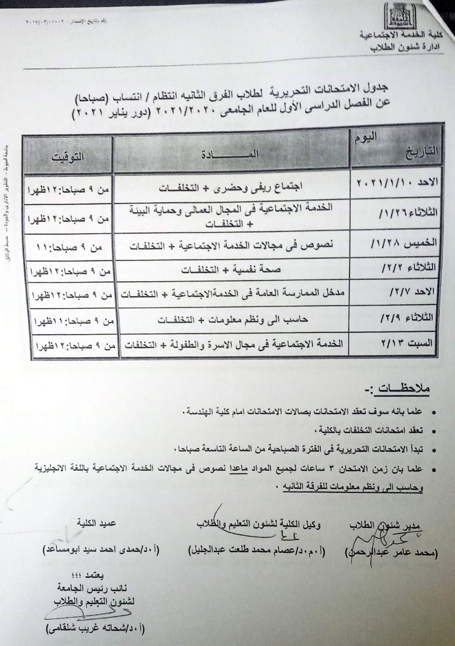 جدول الامتحانات التحريرية لطلاب الفرقة الثانية انتظام/ انتساب عن الفصل الدراسى الأول للعام الجامعى 2020/2021 Read more about جدول الامتحانات التحريرية لطلاب الفرقة الثانية انتظام/ انتساب عن الفصل الدراسى الأول للعام الجامعى 2020/2021 جدول الامتحانات التحريرية لطلاب الفرقة الثانية انتظام/ انتساب عن الفصل الدراسى الأول للعام الجامعى 2020/2021 29 ديسمبر 2020