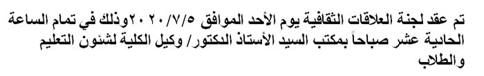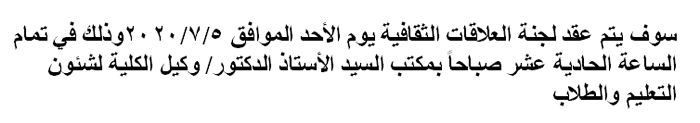 اجتماع لجنة العلاقات الثقافية Read more about اجتماع لجنة العلاقات الثقافية اجتماع لجنة العلاقات الثقافية 2 يوليو 2020