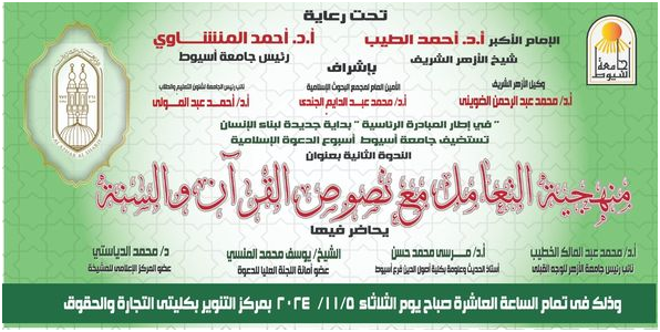 ويُشرف على الفعالية؛ الدكتور أحمد عبد المولى نائب رئيس جامعة أسيوط لشئون التعليم والطلاب، والدكتور محمد عبد الرحمن الضويني وكيل الأزهر الشريف، والدكتور محمد عبد الدايم الجندي الأمين العام لمجمع البحوث الإسلامية.