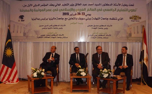 وذلك فى إطار فعاليات المؤتمر الدولي الأول لتطوير التعليم الجامعي في العالم العربي والإسلامي الذي تنظمه جامعة النهضة برئاسة الدكتور صديق عفيفي وجامعة برليس الماليزية التي يمثلها الدكتور عبد الحميد أدوم نائب رئيس الجامعة.