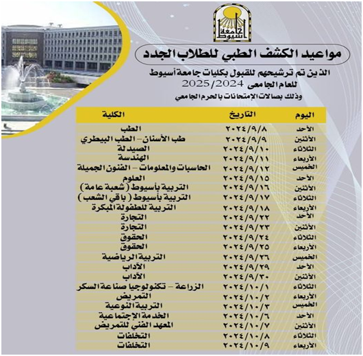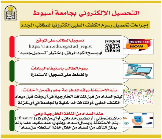جامعة أسيوط تعلن إجراءات تحصيل رسوم الكشف الطبي إلكترونياً للطلاب الجدد عبر منافذ التحصيل الخارجية
