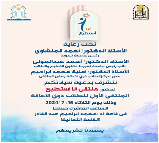 تحت رعاية الدكتور أحمد المنشاوي رئيس جامعة أسيوط؛ تنظم جامعة أسيوط الملتقى الأول؛ لطلاب ذوي الإعاقة "أنا أستطيع" ، يوم الثلاثاء القادم 16 من يوليو، وذلك بحضور الدكتور صلاح هاشم مستشار وزيرة التضامن، والدكتور كريم همام مستشار وزير التعليم العالي للأنشطة الطلابية، والدكتورة شرين يحيى مستشار وزير التعليم العالي لشئون ذوي الإعاقة.
