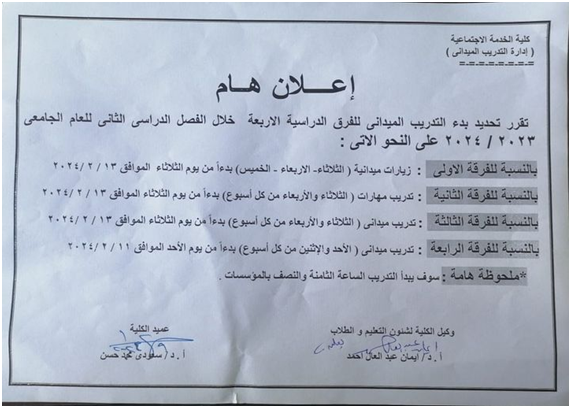 استكمالاﹰ لأنشطة التدريب الميدانى بكلية الخدمة الاجتماعية- جامعة أسيوط داخل المؤسسات الاجتماعية, قام طلاب التدريب الميدانى للفرقتين الثالثة والرابعة بإدارة شرق وإدارة غرب بمجمع المصالح وبمعهد حسين رشدى بعمل حفلة لمعهد الأورام لرسم البسمة على وجوه الأطفال واحتوت الحفلة على فقرات متعددة والتى اشتملت على القرآن الكريم, والاستعراضات, والغناء, وتمثيل الطلاب مسرحية ترفيهية, وتوزيع الهدايا للأطفال.