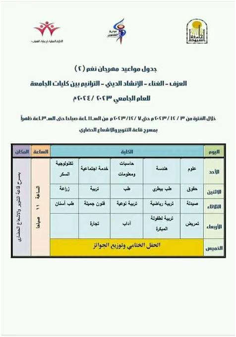 للعام الجامعى ٢٠٢٣/ ٢٠٢٤ م من خلال الفترة من ٢٦ نوفمبر حتى يوم ٧ ديسمبر ٢٠٢٣م من الساعة الرابعة عصرا بقاعة المناقشات بالمبنى الإدارى للجامعة