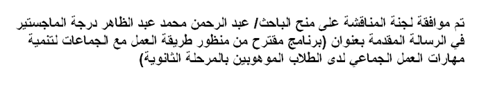 قرار اللجنة بمنح درجة الماجستير للباحث/ عبد الرحمن محمد عبد الظاهر 7 فبراير 2019 قرار اللجنة بمنح درجة الماجستير للباحث/ عبد الرحمن محمد عبد الظاهر