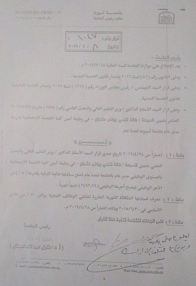 قرار تعيين السيدة الاستاذة/ هاله فتحى رياض اميناً عاماً لكلية الخدمة الاجتماعية 9 مايو 2019 قرار تعيين السيدة الاستاذة/ هاله فتحى رياض اميناً عاماً لكلية الخدمة الاجتماعية