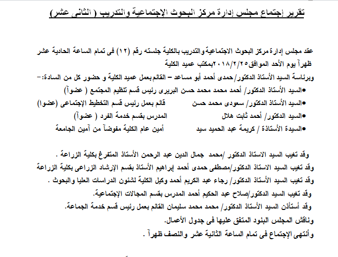 تقرير إجتماع مجلس إدارة مركز البحوث الإجتماعية والتدريب (الثانى عشر) 26 فبراير 2018 تقرير إجتماع مجلس إدارة مركز البحوث الإجتماعية والتدريب (الثانى عشر)