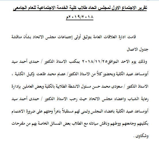 تقرير الاجتماع الاول لمجلس اتحاد طلاب الكلية 26 نوفمبر 2018 تقرير الاجتماع الاول لمجلس اتحاد طلاب الكلية