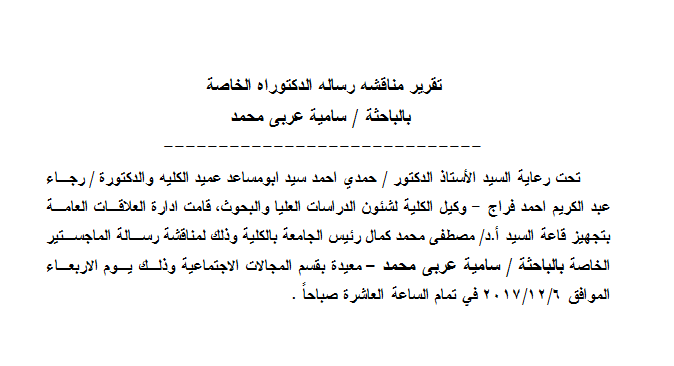 تقرير مناقشه رساله الدكتوراه الخاصة بالباحثة / سامية عربى محمد 4 ديسمبر 2017 تقرير مناقشه رساله الدكتوراه الخاصة بالباحثة / سامية عربى محمد