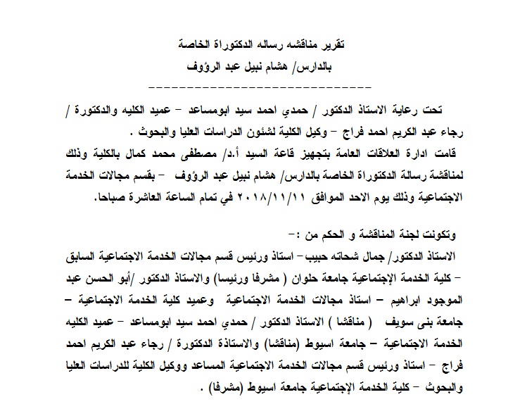 تقرير مناقشه رساله الدكتوراة الخاصة بالدارس/ هشام نبيل عبد الرؤوف 14 نوفمبر 2018 تقرير مناقشه رساله الدكتوراة الخاصة بالدارس/ هشام نبيل عبد الرؤوف