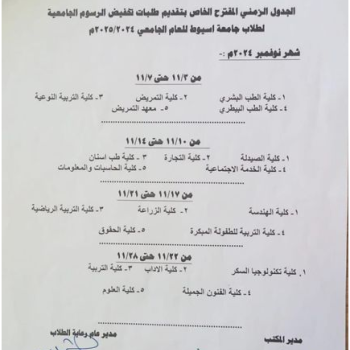 Proposed timetable for submitting tuition fee reduction requests for Assiut University students for the academic year 2024/2025