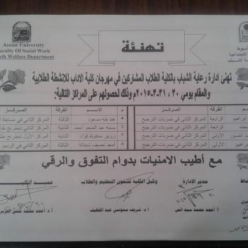 student/ Amjad Nassif Shehata achieved the second level at the university in the drawing competition wich organized at the Faculty of Arts, in the period from 03/30/2015 to 31/03/2015 AD