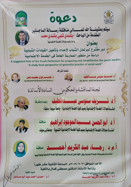 Discussion of the master thesis submitted by the researcher / Khaled Awad Saber Read more about Discussion of the master thesis submitted by the researcher / Khaled Awad Saber Discussion of the master thesis submitted by the researcher / Khaled Awad Saber news category Alumni 21 July 2019