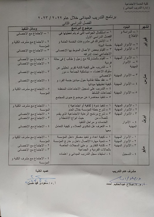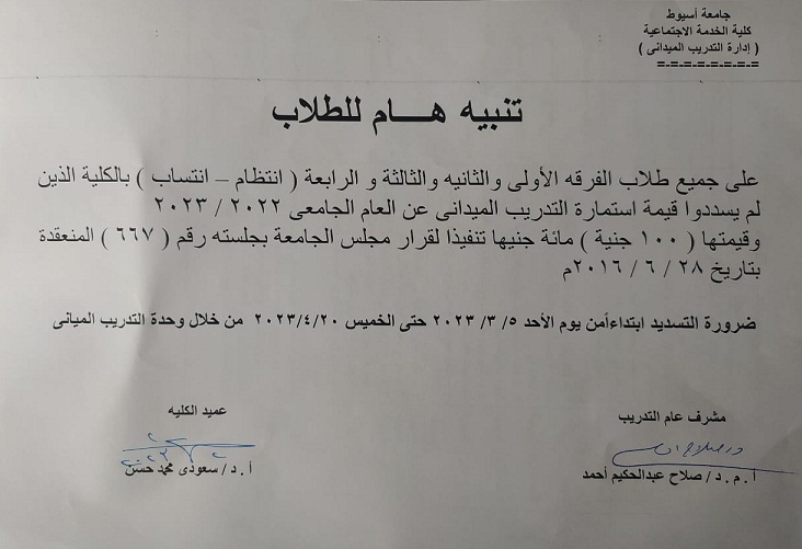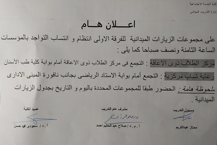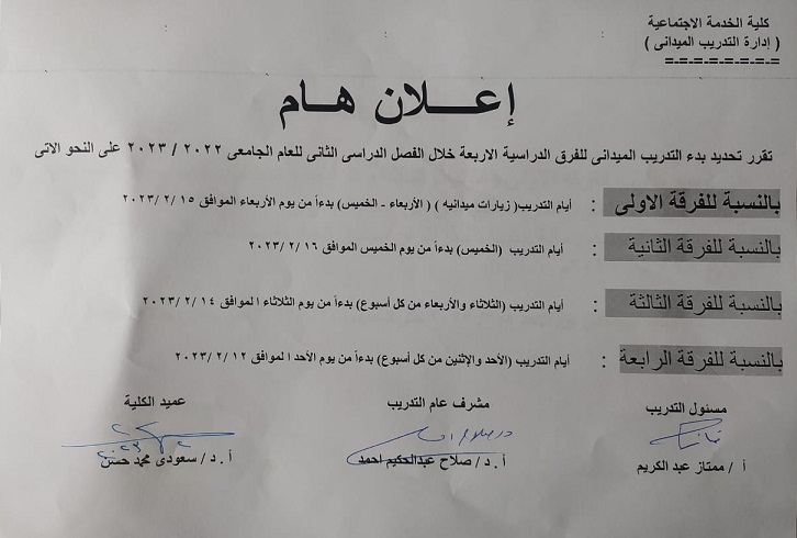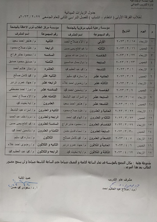 بيان الطلاب المنقطعين عن التدريب الميداني للفرقة الرابعة