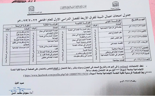 The exam link for each subject will be posted on the official page of the Faculty of Social Work, Assiut University, a quarter of an hour before the specified time, according to the announced schedule.